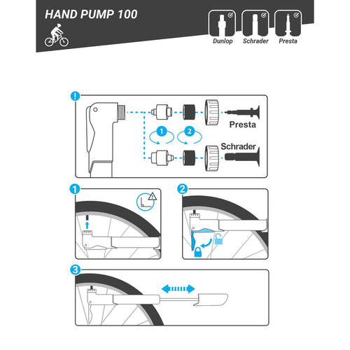 1) حدد الموصل الصحيح لصمام الأنبوب الداخلي (عن طريق قلب جزء من الرأس ، انظر الرسم البياني في صور المنتج).2) ادفع المنفاخ إلى الصمام. 3) استخدم الرافعة الرمادية لتثبيت المنفاخ مكانه. 4) أنفخ إلى الضغط المطلوب.