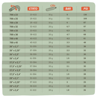 يمكن لاسطوانة ثاني أكسيد الكربون سعة 16 جرامًا أن تنفخ الإطارات إلى الضغوط التالية: الطريق: 700x23C: 9 بار / 130 رطل لكل بوصة مربعة، 700x25C: 7.5 بار / 108 رطل لكل بوصة مربعة، 700x28C: 6 بار / 87 رطل لكل بوصة مربعة، MTB: 29 × 2.1 بوصة: 2.1 بار / 30 رطل لكل بوصة مربعة، 26 × 2.4 بوصة: 1.8 بار / 26 رطل لكل بوصة مربعة، 26 بوصة × 1.95 بوصة: 2.7 بار / 39 رطل لكل بوصة مربعة، 24 بوصة × 2 بوصة: 2.9 بار / 42 رطل لكل بوصة مربعة، 20 بوصة × 2 بوصة: 3.3 بار / 48 رطل لكل بوصة مربعة