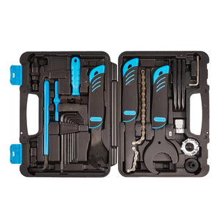 يحتوي صندوق الأدوات على 18 أداة لهم 20 استخدام.يرفق بحقيبة معدات الدراجة جميع الأدوات، والذي يتم غلقه بمشبكين لسهولة النقل والتخزين.