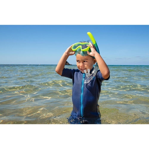 A photo of the بدلة غوص سنوركل قصيرة 2 مم للأطفال 100 - أزرق بحري in use