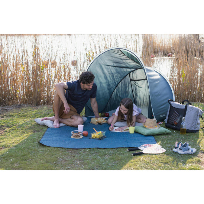 صمم فريق التخييم لدينا هذه الخيمة تو سكند سريعة التركيب والنصب والتي تكفي لشخص بالغ أو طفلين. توفر المأوى من الشمس والرياح الخفيفة وعازلة للتراب.