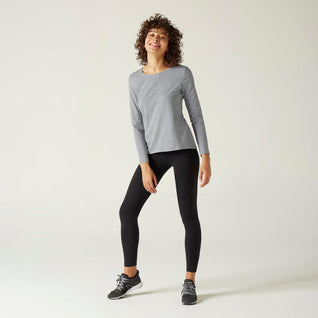 تيشيرت رياضي قطن بأكمام طويلة للياقة البدنية - رمادي مرقش