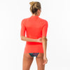 تيشيرت بأكمام قصيرة للنساء مقاوم للأشعة فوق البنفسجية للحماية من أشعة الشمس، حتى في الماء، وللحد من الاحتكاك وتهيج الجلد عند ملامسته للوح ركوب الأمواج. ذات قصة ضيقة للمزيد من الثبات في الأمواج.