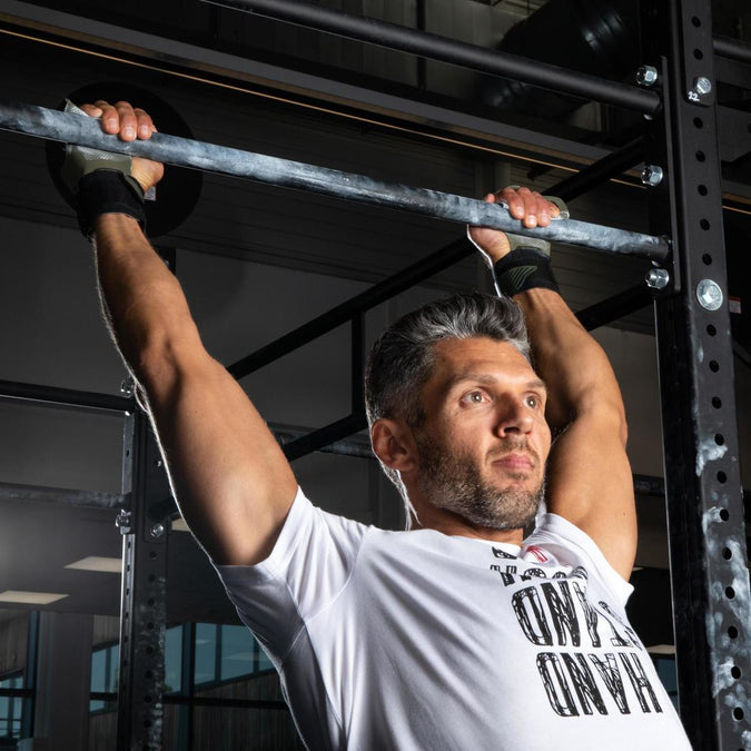 نوصي بوضع مسحوق كربونات المغنيسيوم على القفاز المفتوح قبل كل استخدام لتدعيم قبضتك على بار الأوزان.
