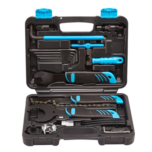 يحتوي صندوق الأدوات على 18 أداة لهم 20 استخدام.يرفق بحقيبة معدات الدراجة جميع الأدوات، والذي يتم غلقه بمشبكين لسهولة النقل والتخزين.