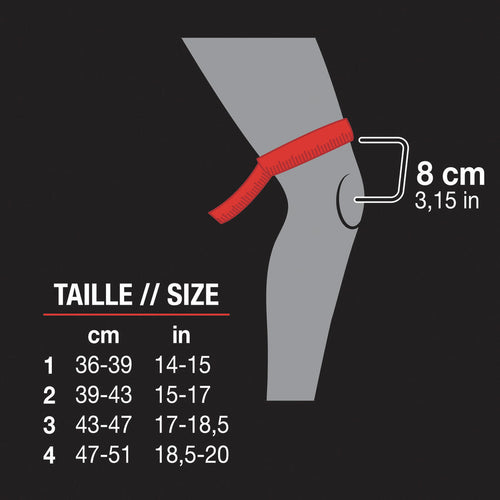 قم بالقياس حول ساقك على ارتفاع 8 سم فوق الركبة. ثم قم بمطابقة القياس المأخوذ مع مخطط المقاس التالي:مقاس1: 36 - 39 سممقاس 2: 39 - 43 سممقاس 3: 43 - 47 سممقاس 4: 47 - 51 سم