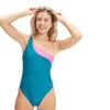 تألقي بجانب حمام السباحة بارتداء مايوه السباحة اسميتريك هذه باللون الأزرق المخضر المذهل مع طبقة متباينة باللون الأرجواني الزاهي.