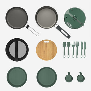 مناسب للاستخدام مع موقد الحطب أو موقد الغاز أو موقد الحث، ويحتوي على كل ما تحتاجه من أطباق وأدوات مائدة وأكواب.مثالي للاستمتاع بوجبة شهية بعد يوم حافل في الهواء الطلق.